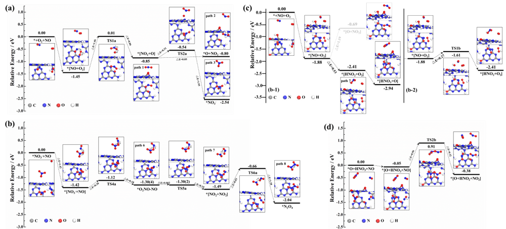 图1 氮化碳(a,b)和羟基化氮化碳(c,d)表面NO反应势能剖面图