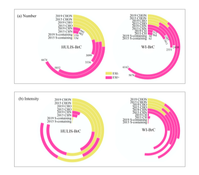 北京大气污染减排措施的实施有效减少了PM2.5浓度,其中“煤改气”工程作用显著。然而“煤改气”工程对棕碳的影响并不十分清楚。 中国科研院地球环境研究所黄汝锦研究员团队对北京“煤改气”工程前后类腐殖质棕碳(HULIS-BrC)和水不溶性棕碳(WI-BrC)组分元素组成进行研究。发现不同元素组成发色团数量为CHON>CHO>CHN>(CH)>含S发色团,“煤改气”工程后HULIS-BrC发色团数量增加了约14%,而WI-BrC发色团数量减少了约8%。 |