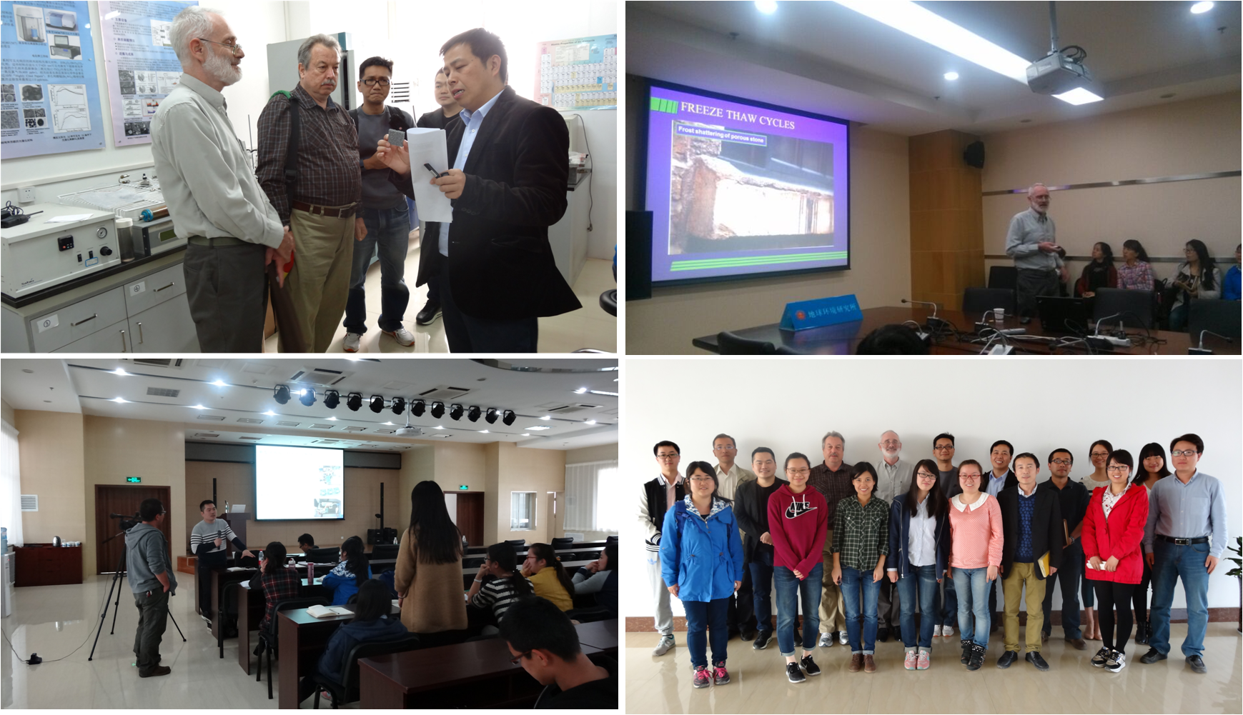 416日上午,Peter Brimblecombe, Frederick Dane Westerdahl博士,宁治博士以及何建辉博士参观了微粒K8凯发化学与物理重点实验室,并听取实验室研究进展汇报。之后,Peter Brimblecombe “Chemistry of salts and crusts relevant to the conservantion of heritage materials”的报告中详细介绍了世界各地文物遗址中存在的问题,讲述文物界面发生的反应,分析文物破坏机理。当天下午,Frederick Dane Westerdahl博士分享了自己40多年的研究经验,全面介绍了在线监测仪器在选型、校准、质量控制方面应该注意的问题,并与实验室仪器管理人员进行了深入研讨。417日下午,宁治博士介绍了香港城市大学在新型传感器的研发和应用方面的案例,并就电化学传感器校准时湿度的控制原因和方法做了深入讲解,会后与在场的老师、同学进行了热烈讨论。