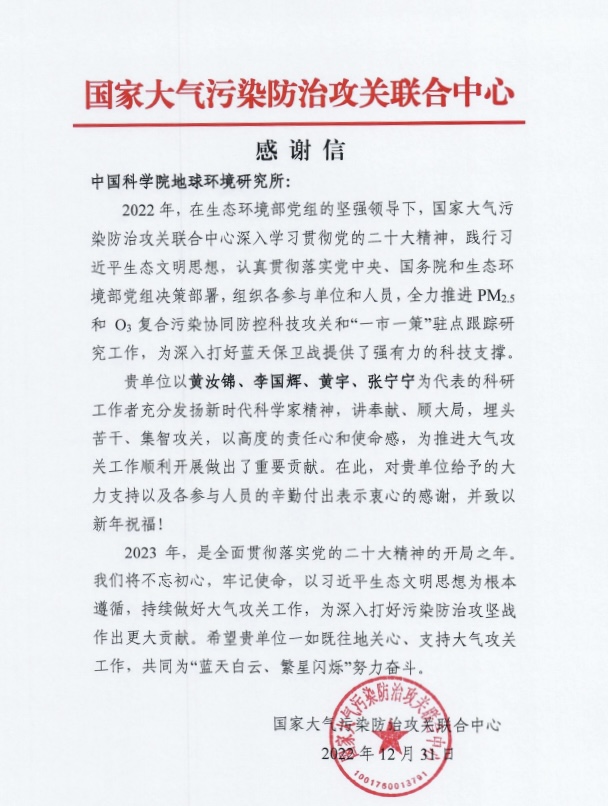 日,国家大气污染防治攻关联合中心给大气所发来感谢信,感谢我所